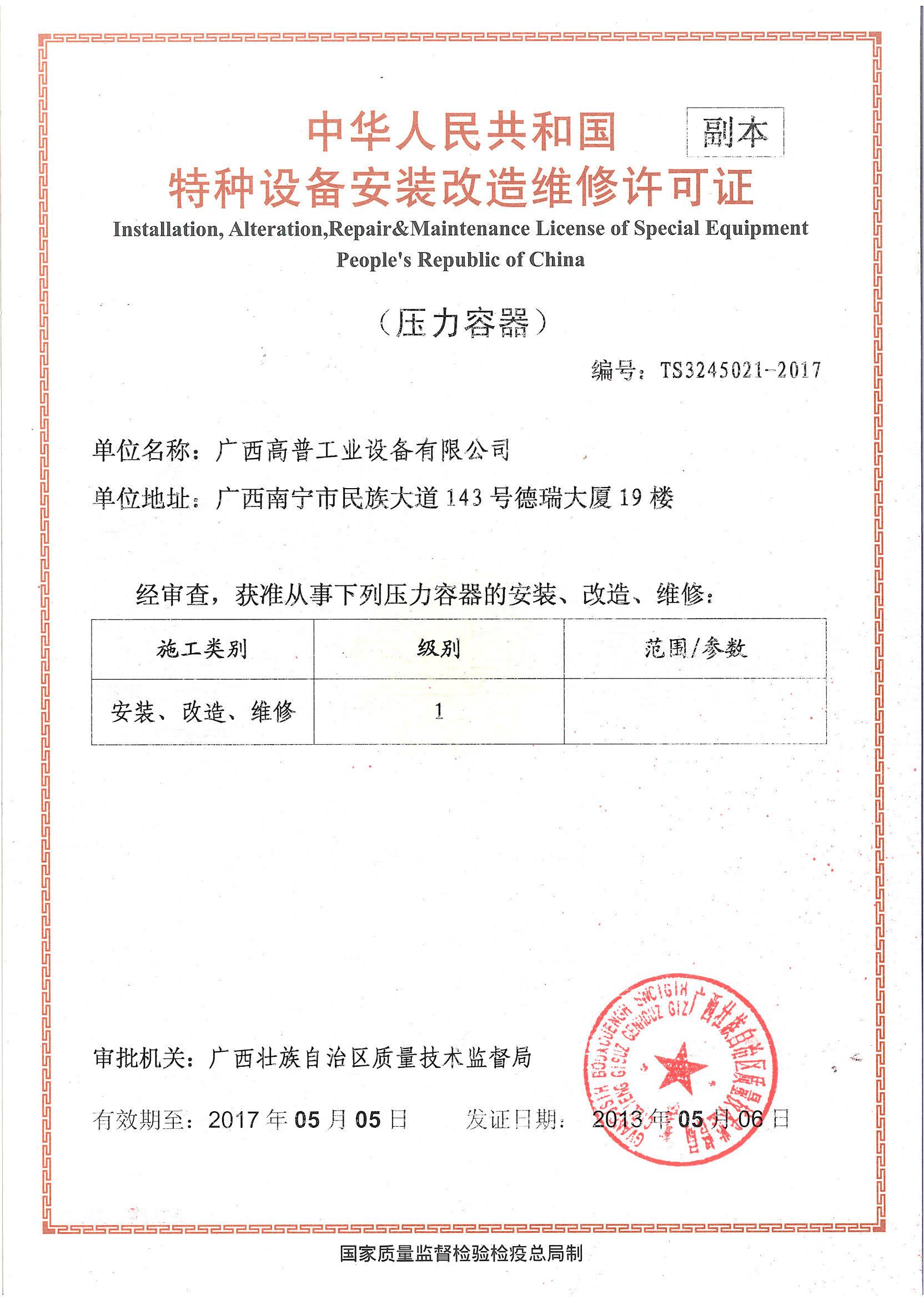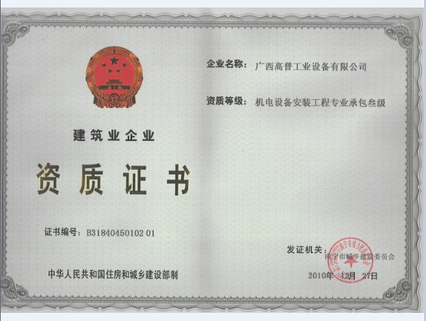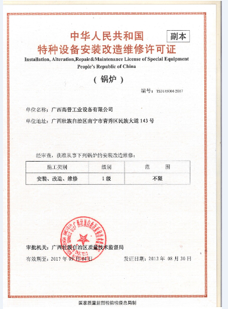 本公司是高新技術(shù)企業(yè),持有國家技術(shù)監(jiān)督局頒發(fā)的1級《特種設(shè)備安裝、改造、維修(鍋爐)》許可證,1級許可證是最高級別,可安裝、改造、維修任何形式、參數(shù)的鍋爐設(shè)備。并持有《壓力管道》安裝、改造維修許可證,1級《壓力容器》安裝、改造、維修,機電設(shè)備安裝工程專業(yè)承包3級等資質(zhì)。