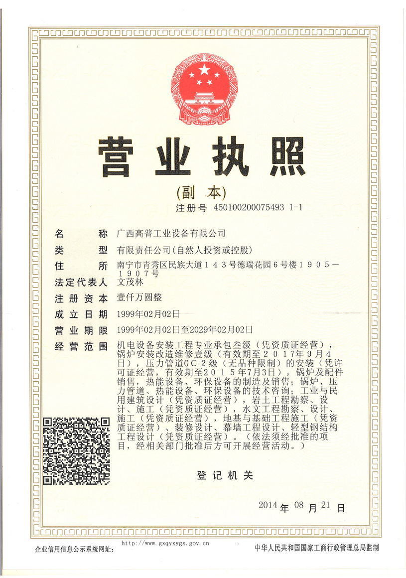 廣西高普工業(yè)設(shè)備有限公司的前身是南寧高普熱能設(shè)備有限公司,是一家成立于1998年,具有獨立企業(yè)法人資格的的有限責(zé)任公司。公司總部設(shè)在廣西首府南寧。在云南、宜賓等多處地方、地區(qū)設(shè)有辦事及分公司。
